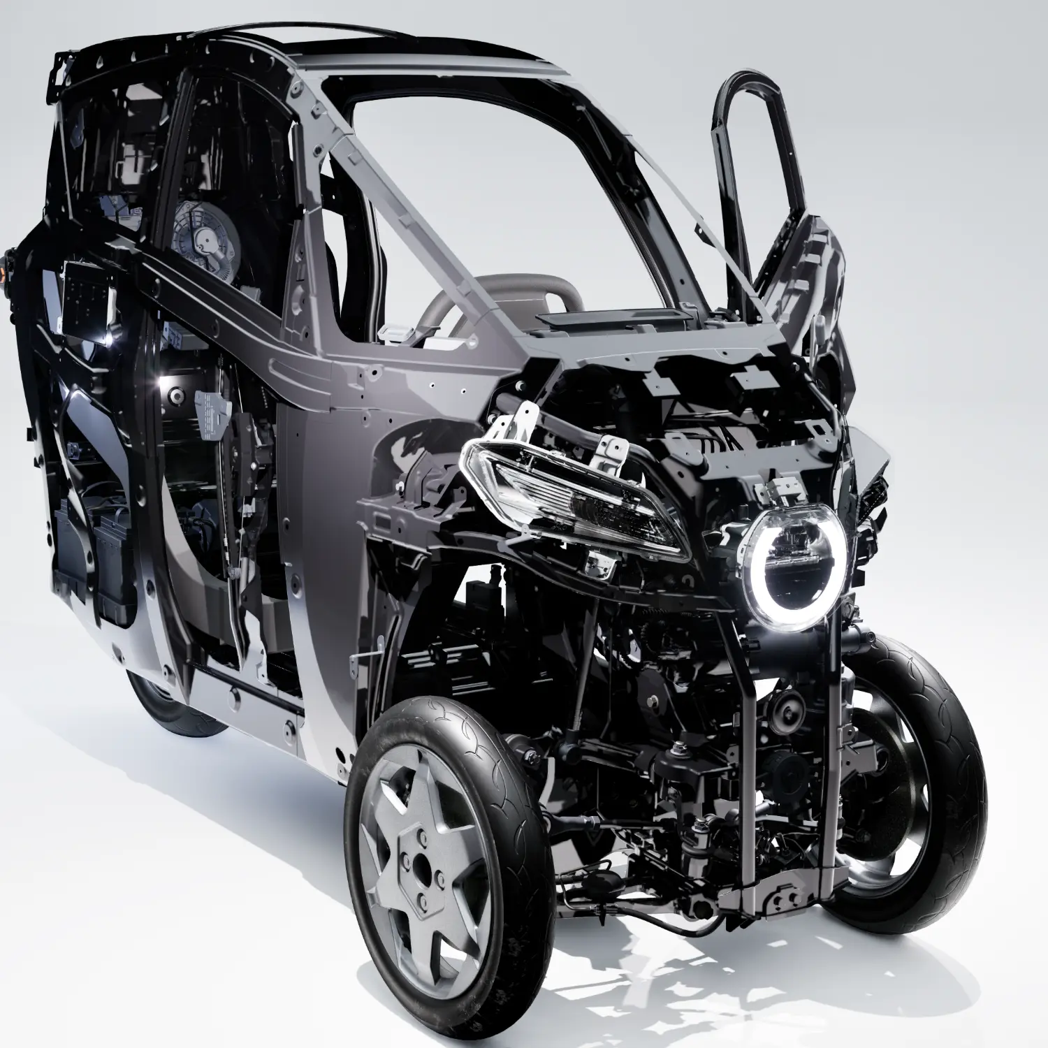 Lean3 features a front dual-wheel steering and rear single-wheel drive three-wheel configuration, measuring just 2,470 mm long × 970 mm wide, making it one of the smallest urban EVs. Its proprietary Active Lean System automatically adjusts the vehicle’s tilt on corners or uneven roads, ensuring stability. With a 100 km range and standard air conditioning, Lean3 significantly improves on conventional micro EVs.
